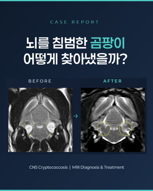고양이 크립토코쿠스 감염, 뇌를 침범한 곰팡이 MRI로 어떻게 찾아냈을까요? 환자 정보 및 내원 배경 종: 고양이 품종: 아메리칸 숏헤어 나이: 10살 주증상: 원인을 알 수 없는 통증, 기력 저하 겉으로 보이는 증상만으로는 원인을 특정하기 어려운 상태였기 때문에 보다 정확한 확인을 위해 MRI 검사를 진행했습니다. 크립토코쿠스는 어떤 질환인가요? 크립토코쿠스는 환경 중에 존재하는 곰팡이, 즉 효모균의 일종입니다. 호흡기를 통해 감염될 수 있으며 면역력이 떨어져 있는 경우에는 몸 안으로 퍼져 더 큰 문제를 일으킬 수 있습니다. 특히 경우에 따라서는 뇌와 신경계까지 퍼지면서 신경 증상을 유발할 수 있습니다. 그래서 단순히 컨디션이 떨어진 것처럼 보이더라도 실제로는 정밀한 확인이 필요한 상황일 수 있습니다. 고양이 환자는 어떤 증상으로 내원했나요? 환자는 10살 아메리칸 숏헤어 고양이로 원인을 알 수 없는 통증과 기력 저하를 보여 내원했습니다. 이러한 증상은 겉으로 보기에는 막연하게 느껴질 수 있어 보호자님께서도 많이 걱정하게 됩니다. 하지만 신경계 질환은 원인이 겉으로 드러나지 않는 경우가 많기 때문에 증상만으로 판단하기보다 정확한 검사가 중요합니다. 왜 MRI 검사를 진행했나요? 고양이와 강아지의 신경계 질환은 겉으로 보이는 모습만으로 원인을 정확히 파악하기 어려운 경우가 많습니다. 통증, 기력 저하, 걸음걸이 변화, 발작 같은 증상은 단순한 컨디션 문제처럼 보일 수도 있지만 실제로는 뇌나 신경계 이상과 관련되어 있을 수 있습니다. 이번 환자도 원인을 정확히 확인하기 위해 MRI 검사를 진행했습니다. MRI에서는 어떤 이상이 확인됐나요? MRI T2-weighted image에서 양측 전두엽에 T2W 고신호 구형 병변 양측 trigeminal ganglion 위치에 T2W 고신호 구형 병변이 확인되었습니다. 이 소견은 중추신경계에 염증성 병변이 있을 가능성을 시사했고, 단순한 통증이나 일시적인 컨디션 저하가 아니라는 점을 확인하는 중요한 단서가 되었습니다. MRI에서 염증성 병변 가능성이 보여, 추가로 뇌척수액 천자를 진행했습니다. 이후 PCR 검사를 시행한 결과, Cryptococcus spp. 양성이 확인되었습니다. 최종적으로 중추신경계 크립토코쿠스증(CNS Cryptococcosis)으로 진단하였습니다. 어떻게 치료했나요? 정확한 MRI 진단 덕분에 신속하게 항진균제 치료를 시작할 수 있었습니다. 신경계 질환은 진단이 늦어질수록 치료 시작도 늦어질 수 있기 때문에 초기 단계에서 정확한 영상 검사와 판독이 아주 중요합니다. 치료 후에는 임상 증상이 뚜렷하게 개선되었고 추적 MRI에서도 기존에 확인되던 병변의 크기가 확연히 감소한 것이 확인되었습니다. 현재는 신경 증상이 모두 사라져 건강하게 회복 중입니다. 아이들의 신경계 질환은 겉으로 원인을 쉽게 알기 어려운 경우가 많습니다. 평소와 다른 걸음걸이, 이유를 알 수 없는 통증, 기력 저하, 발작과 같은 증상을 보인다면 단순한 일시적 변화로 넘기지 않는 것이 중요합니다. 리본동물영상센터는 대학병원급 영상 장비를 갖추고 있으며 영상의학과와 내과 석박사 의료진이 직접 판독하는 영상진단센터입니다. 강아지,고양이는 겉으로 보이는 증상만으로 원인을 정확히 알기 어려운 경우가 많습니다. 특히 신경계 질환이나 내부 장기 질환은 단순한 컨디션 저하로 보이기도 해 보다 정밀한 확인이 필요합니다. 리본동물의료센터 영상센터는 영남권 최초 3.0T MRI와 64채널 CT를 비롯한 고사양 영상 장비를 바탕으로 보다 정밀한 검사를 시행하고 있습니다. MRI 8,000건 이상, CT 5,000건 이상, 초음파 30,000건 이상, X-ray 30,000건 이상의 검사 경험을 바탕으로 다양한 케이스를 진단해왔습니다. 정확한 장비와 풍부한 판독 경험을 바탕으로 우리 아이 건강을 지켜내겠습니다. 감사합니다.